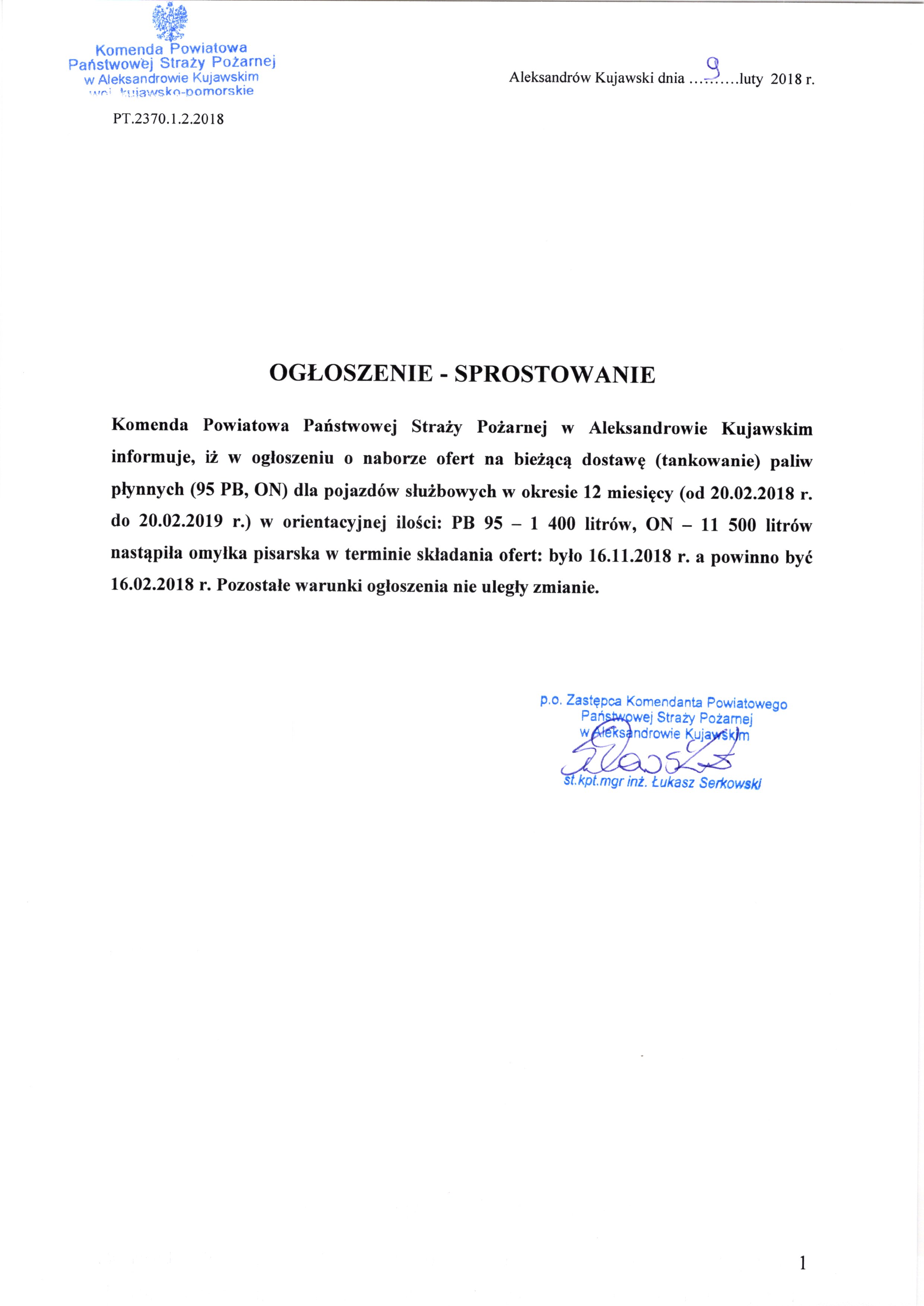 ogłasza nabór ofert na bieżącą dostawę ( tankowanie ) paliw płynnych (95 PB, ON) dla pojazdów służbowych w okresie 12 miesięcy ( od 20.02.2018 r. do 20.02.2019 r. )