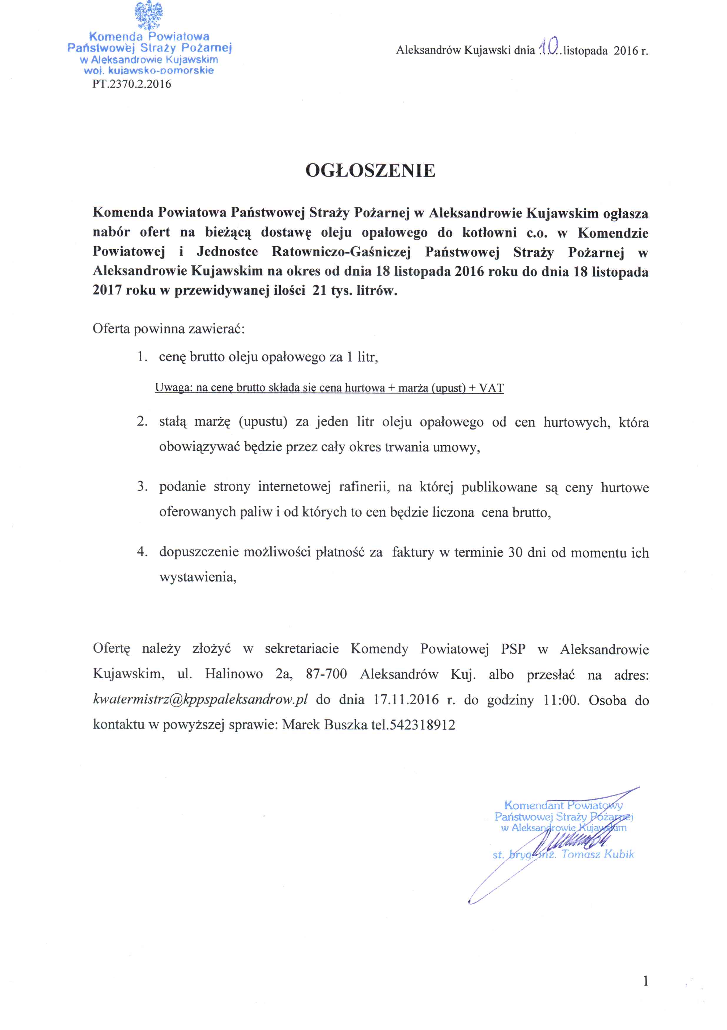 Ogłoszenie o naborze ofert na bieżącą dostawę oleju opałowego do kotłowni c.o.w Komendzie Powiatowej PSP w Aleksandrowie Kuj.
