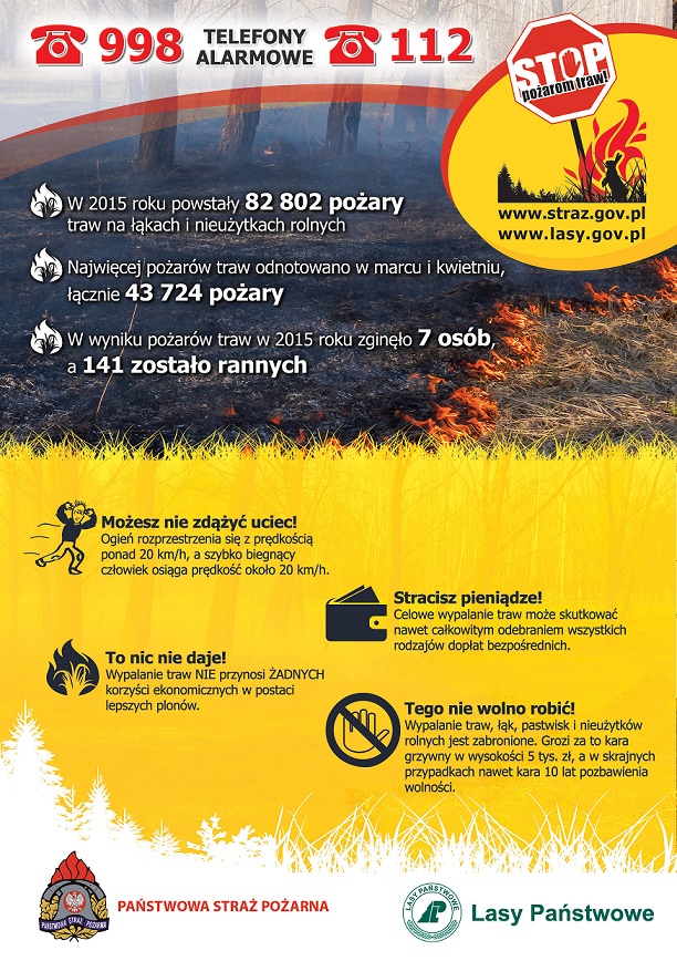 Przełom zimy i wiosny to okres, w którym zawsze gwałtownie wzrasta liczba pożarów traw na łąkach i nieużytkach rolnych. Ma to związek z wypalaniem suchych traw i pozostałości roślinnych. Pamiętajmy, że pożary traw są niebezpieczne dla życia i zdrowia ludzi, zwierząt oraz środowiska naturalnego. Zagrażają lasom, domom mieszkalnym i zabudowaniom gospodarczym, bezpowrotnie niszczą faunę i florę. Stwarzają też niebezpieczeństwo dla podróżujących, gdyż dym znacznie ogranicza widoczność, co może doprowadzić do groźnych wypadków i kolizji.