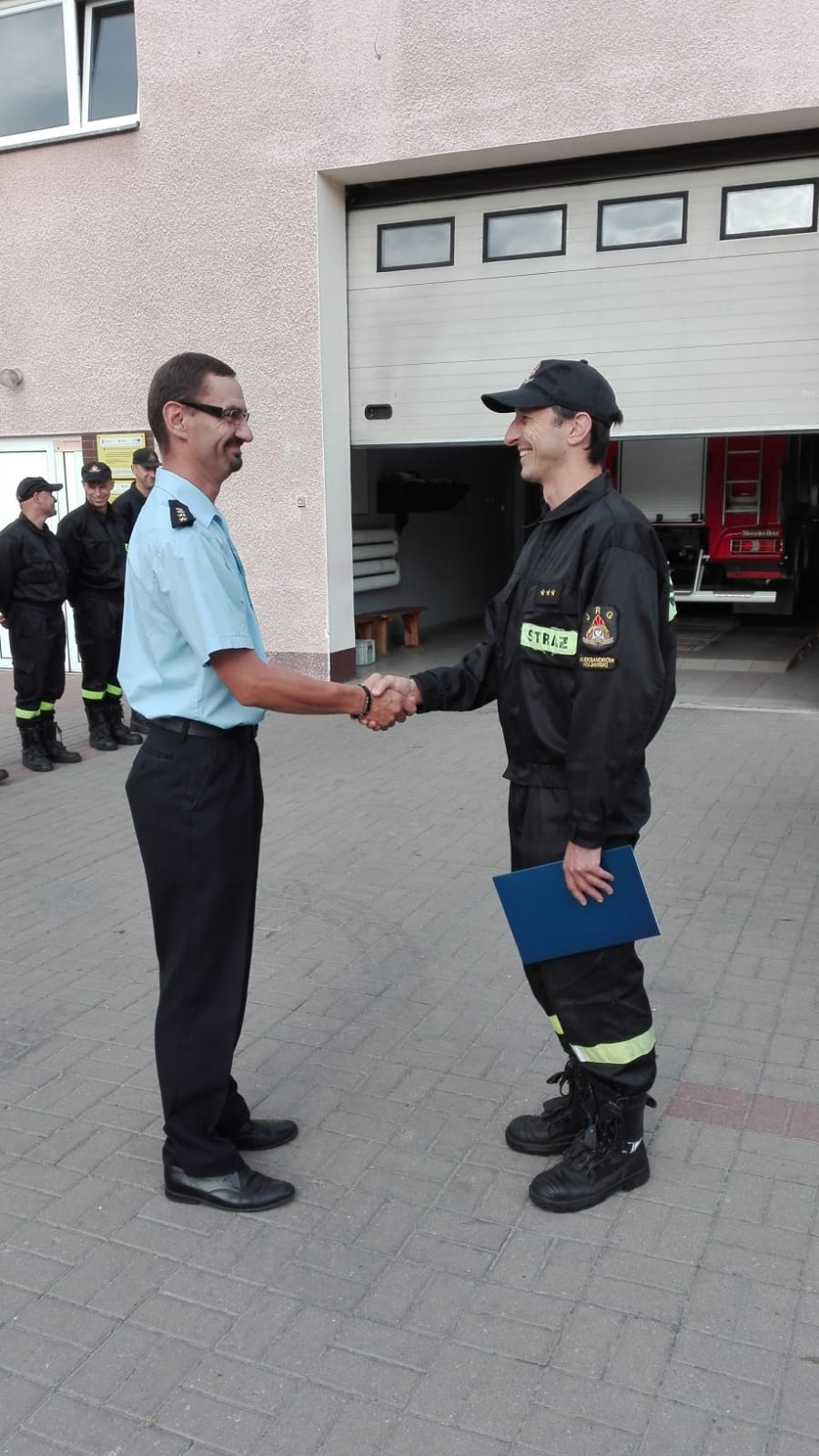 w Aleksandrowie Kujawskim st. kpt. Łukasz Serkowski. Uroczysty charakter zmiany służbowej wiązał się z jubileuszem pracy i służby w szeregach Państwowej Straży Pożarnej naszych kolegów: asp. sztab. Radosława Bajdalskiego - dowódcy zmiany oraz starszego operatora sprzętu specjalnego - st. ogn. Roberta Kacprzaka. Komendant Powiatowy wręczył listy gartulacyjne z okazji 20 lat służby oraz podziękował za dotychczasową długoletnią pracę, rzetelną służbę